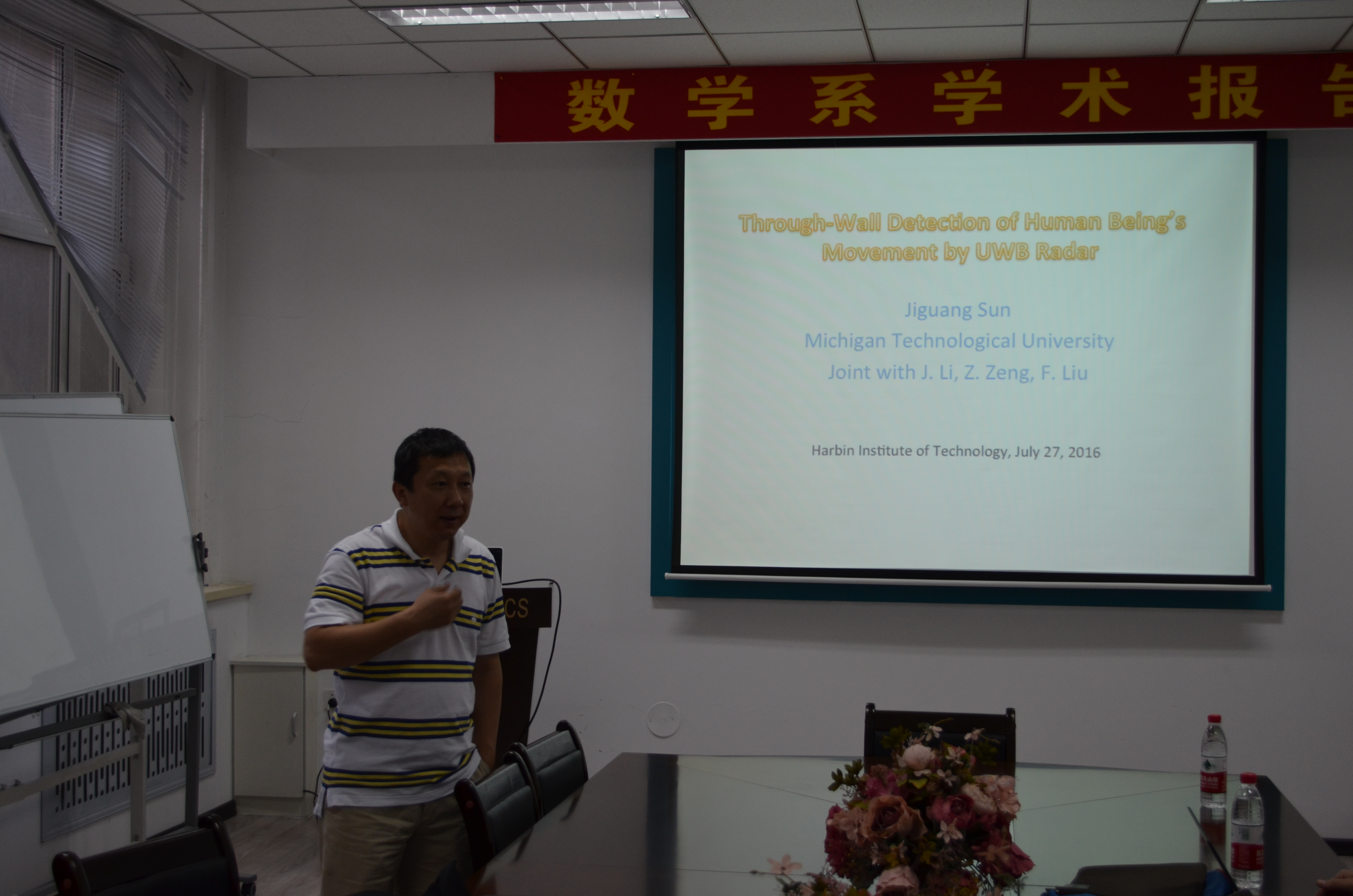 2016 年7月27日下午14:00-15:00,美国密歇根科技大学(Michigan Technological University)数学系终身教授孙继广在数学系会议室(格物楼503)作了题为《Through-Wall Detection of Human Being's Movement by UWB Radar》的学术报告,报告由郭玉坤老师主持,数学系10余位师生听取了报告并进行了热烈的讨论。