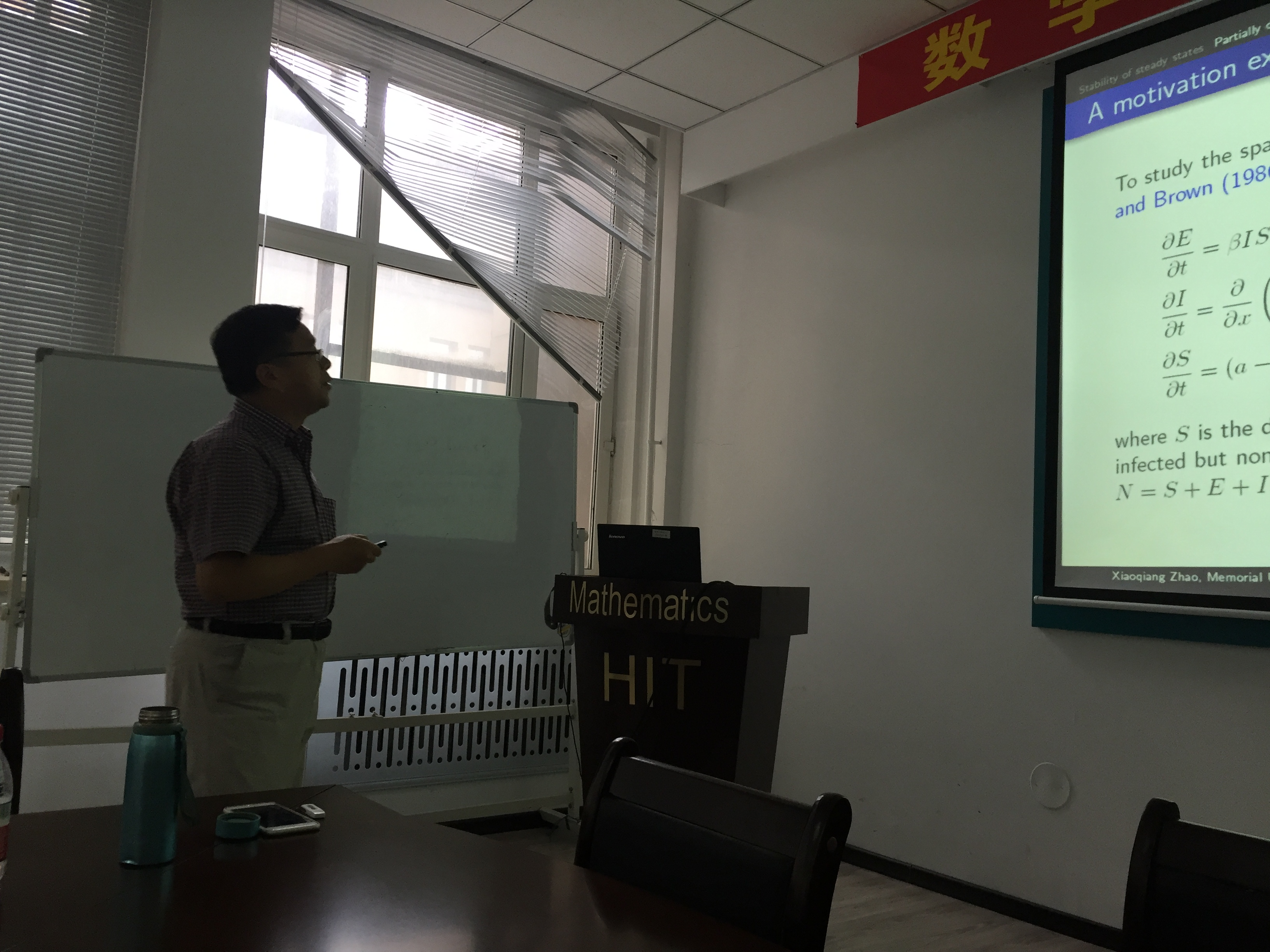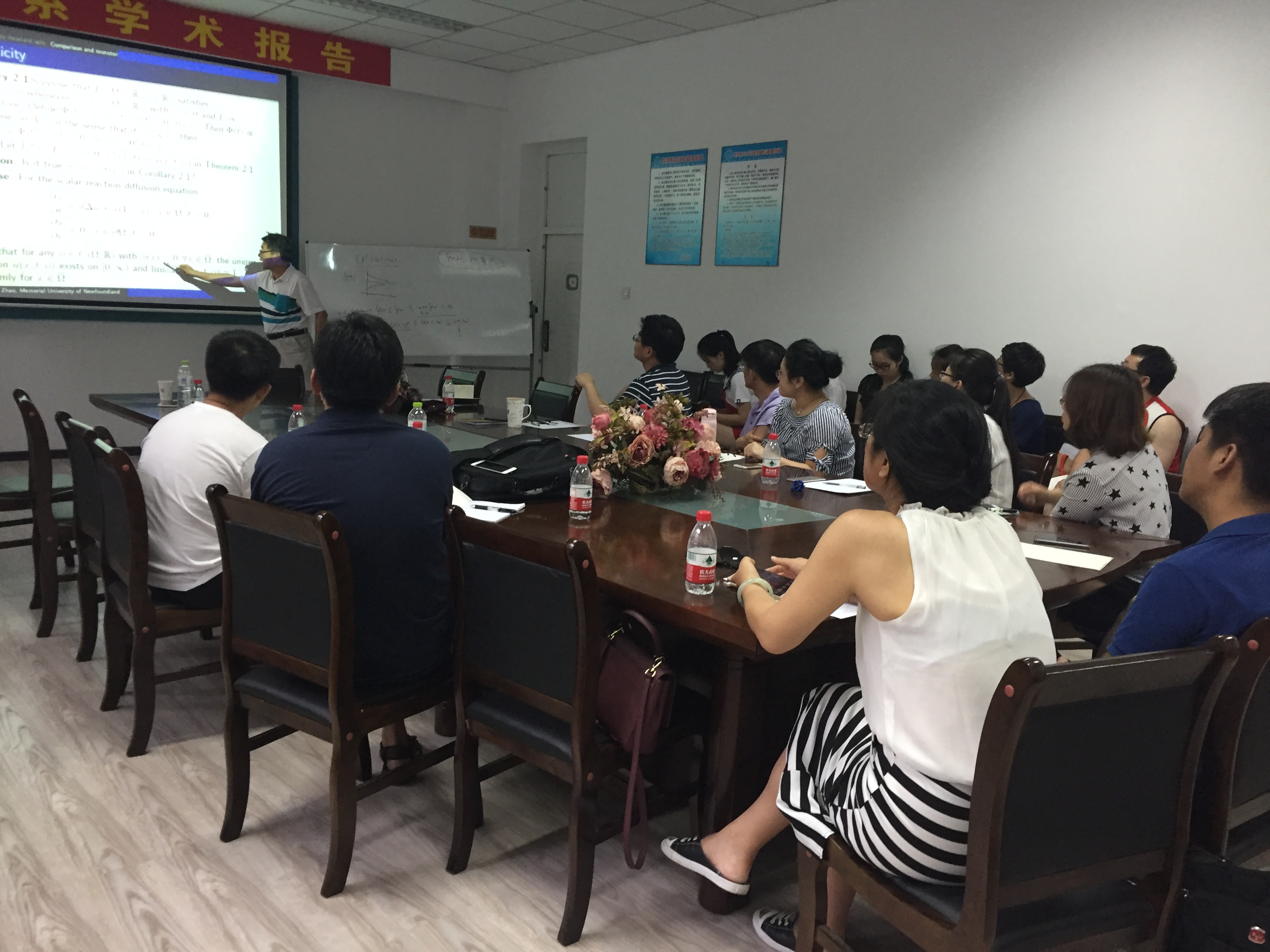 受国际合作处的资助,作为数学系SCI期刊编委校园行活动一部分,著名应用动力系统专家、加拿大纽芬兰纪念大学赵晓强教授应蒋卫华教授的邀请,于2017年7月1日至14日在威廉官网中国官方网站数学系做访问交流。 赵晓强教授以反应扩散方程和动力系统研究中的几个热点问题为主题,在7日、9日、11日下午14:00-17:00,分别从反应扩散方程解的存在唯一性、正不变性、有界性、单调性等基本性质,稳定性与主特征值,吸引子和持久性,基本再生数,抽象泛函微分方程解映射的紧性等方面做了六个精彩的学术报告。报告由蒋卫华教授主持,相关专业的四十余位师生有幸参与讲座和讨论,报告也吸引了包括哈尔滨工程大学、哈尔滨师范大学、黑龙江大学、哈尔滨理工大学和东北林业大学的多位师生慕名前来参加。赵老师的系列报告系统、全面、细致、深入,师生们从中收获颇丰。