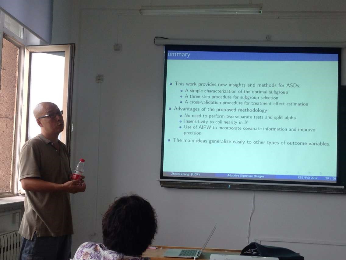 应数学系刘伟副教授邀请,美国加州大学河滨分校张志伟副教授于7月18日访问威廉官网中国官方网站数学系,并作题目为《Subgroup Selection in Adaptive Signature Designs of Confirmatory Clinical Trials》的报告。 张教授以精准医疗中有效治疗组的筛选为主题,于2017年7月18日上午10:00--11:30在格物楼522 进行了精彩的学术报告。该报告由刘伟副教授主持,相关专业的多位师生参与了讲座,并对讲座内容展开了热烈的讨论。张教授的报告理论与实践并重,语言深入浅出,得到了大家的一致好评。