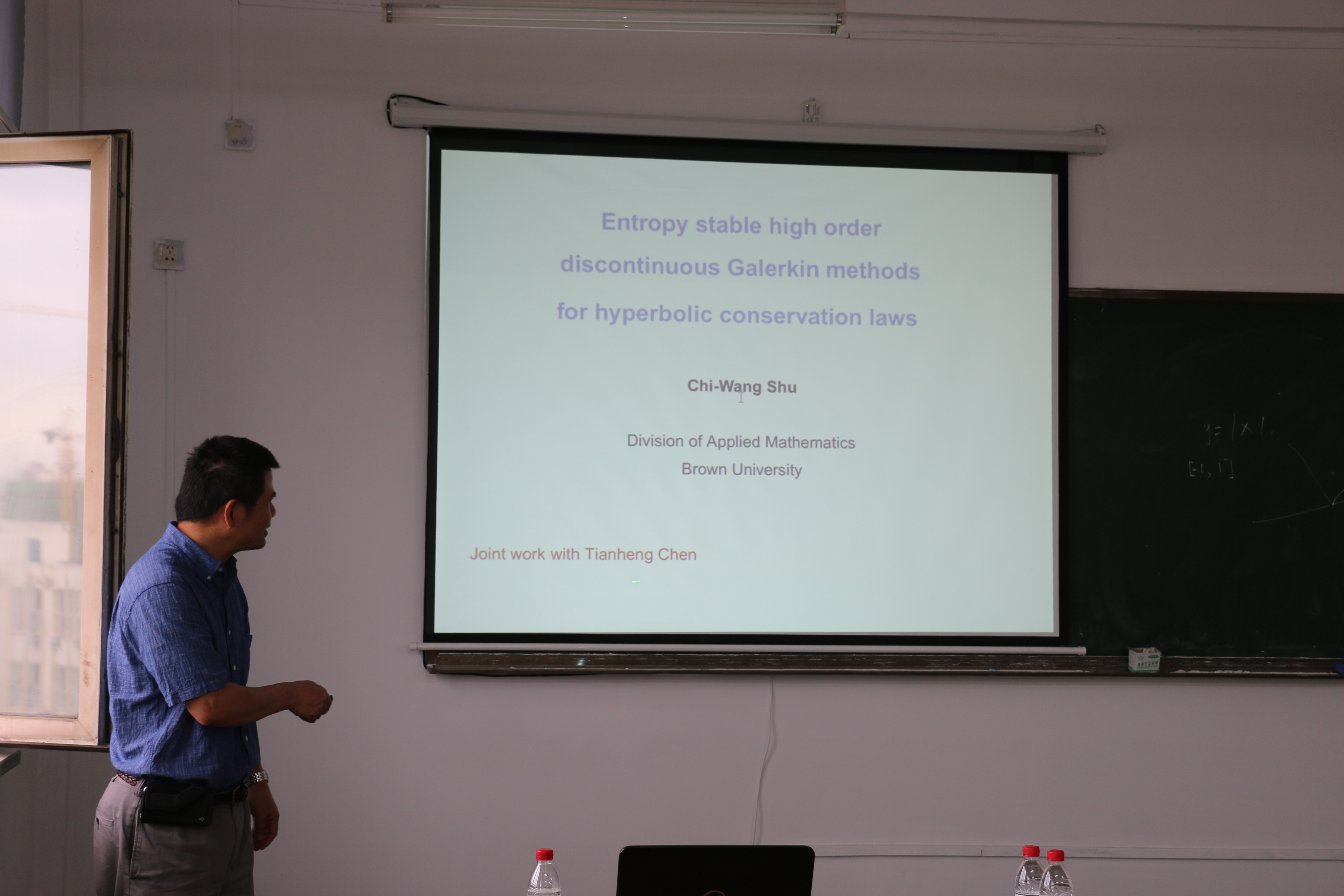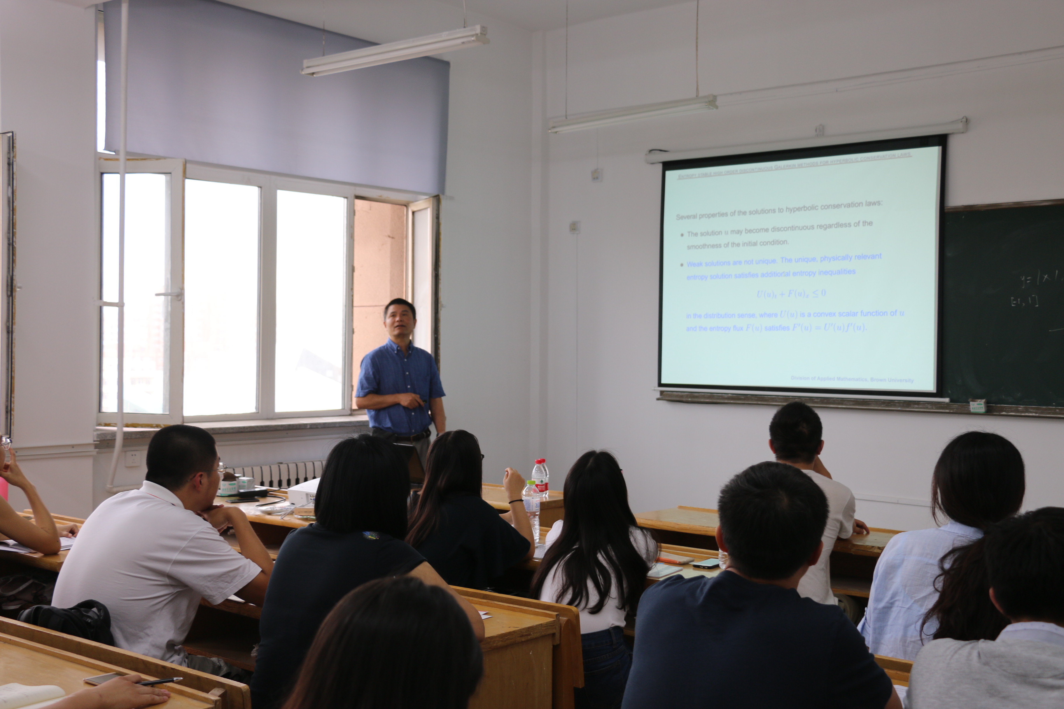 受国际合作处资助,应数学系吴勃英教授和数学系与数学研究院孟雄副教授邀请,美国布朗大学舒其望教授近日访问了我校,并于2017年7月20日上午10:00-11:00在格物楼522会议室作了题为“Entropy stable high order discontinuous Galerkin methods for hyperbolic conservation laws”的学术报告,报告由孟雄副教授主持,数学系30余位师生听取了报告并进行了热烈的讨论。报告主要介绍了对于一般熵函数情形间断有限元方法的单元熵不等式、稳定性分析及算法实现。
