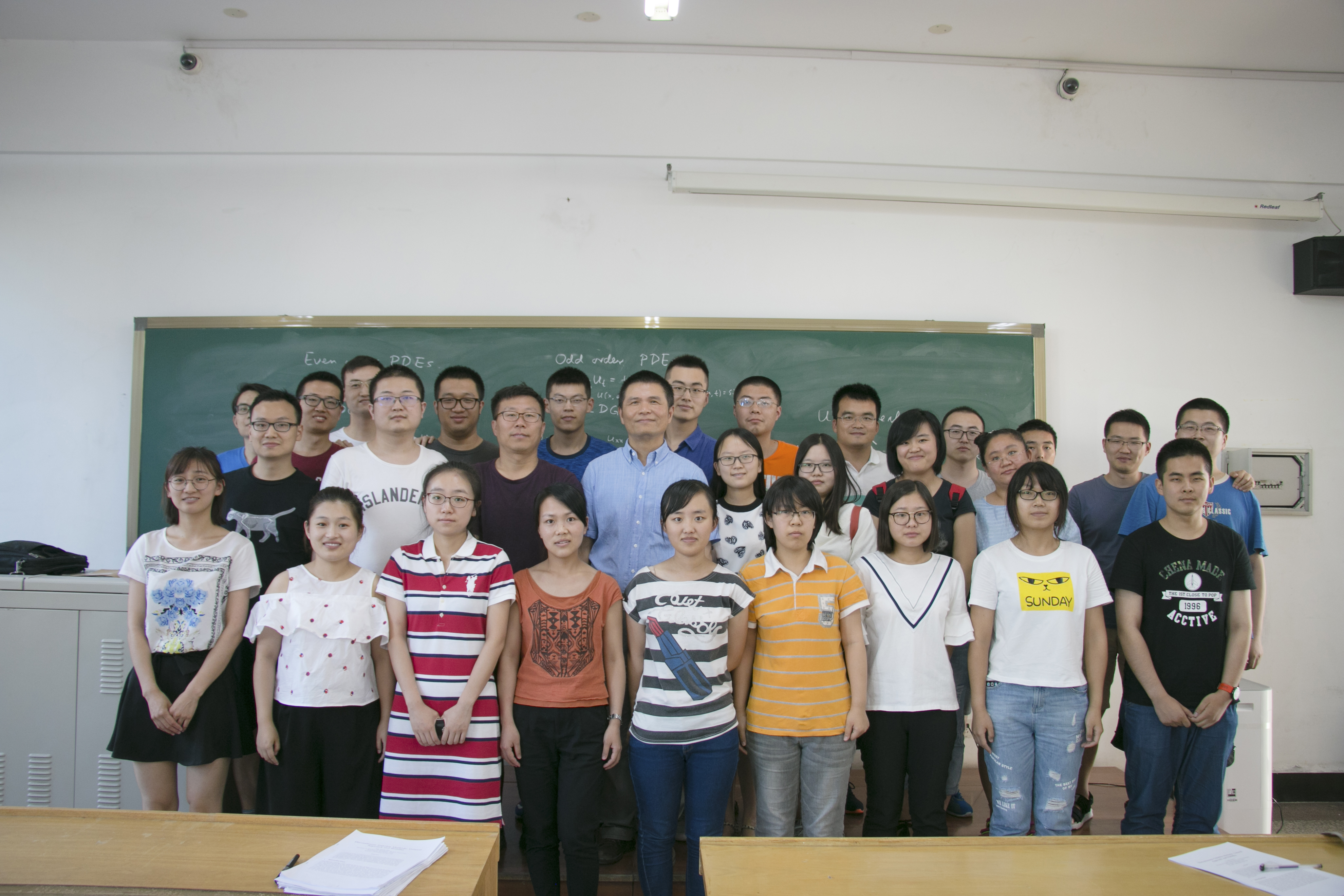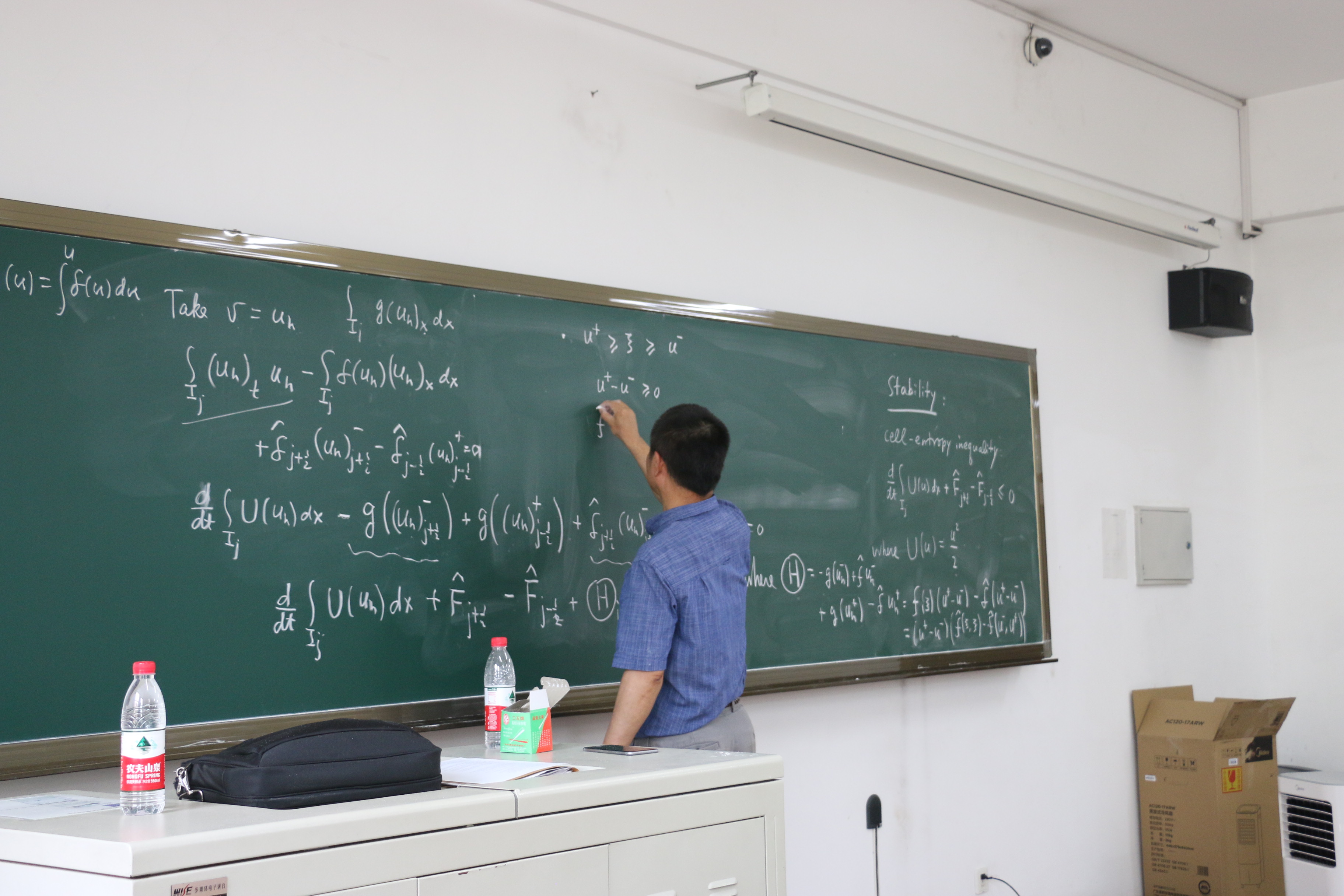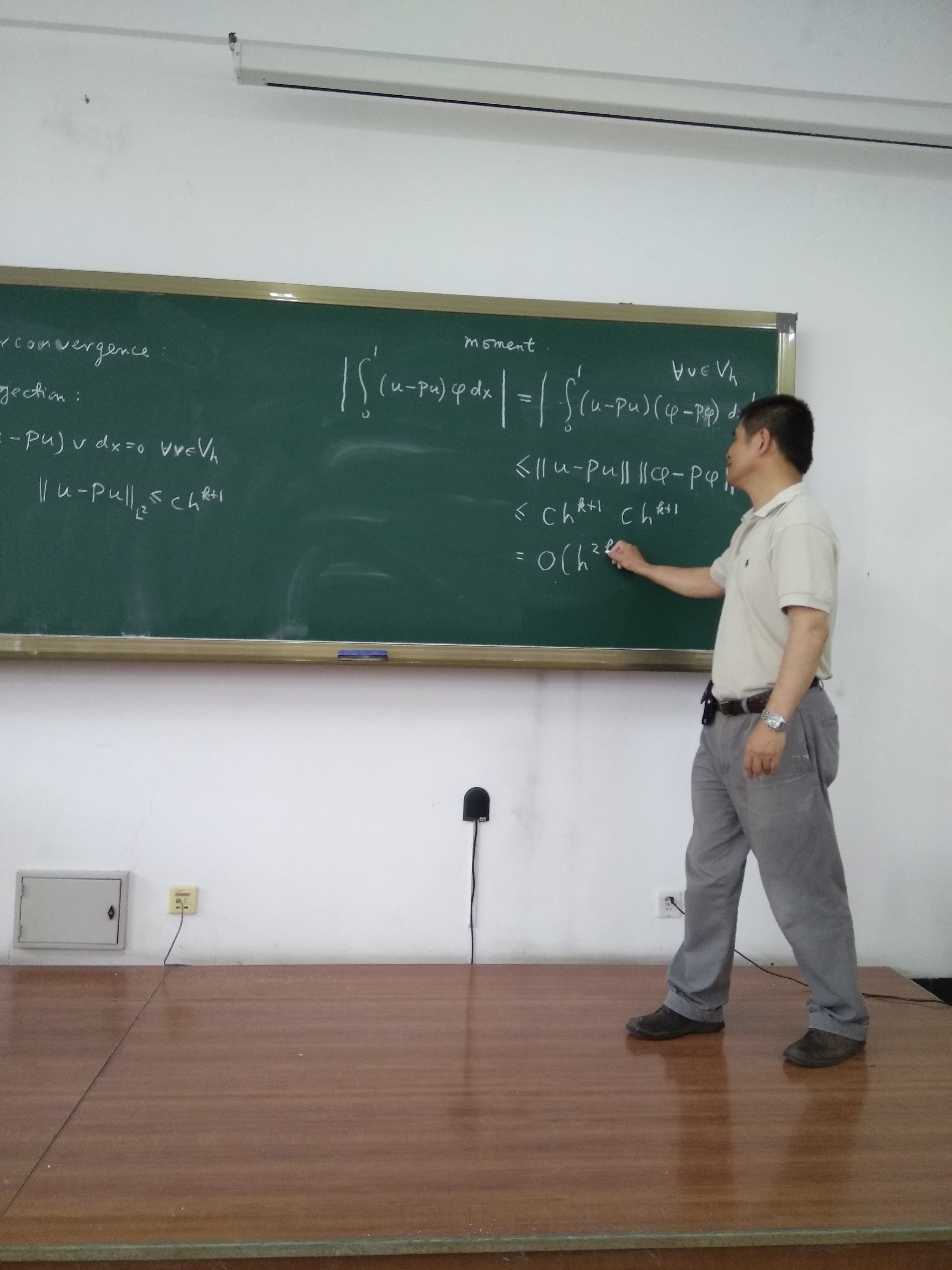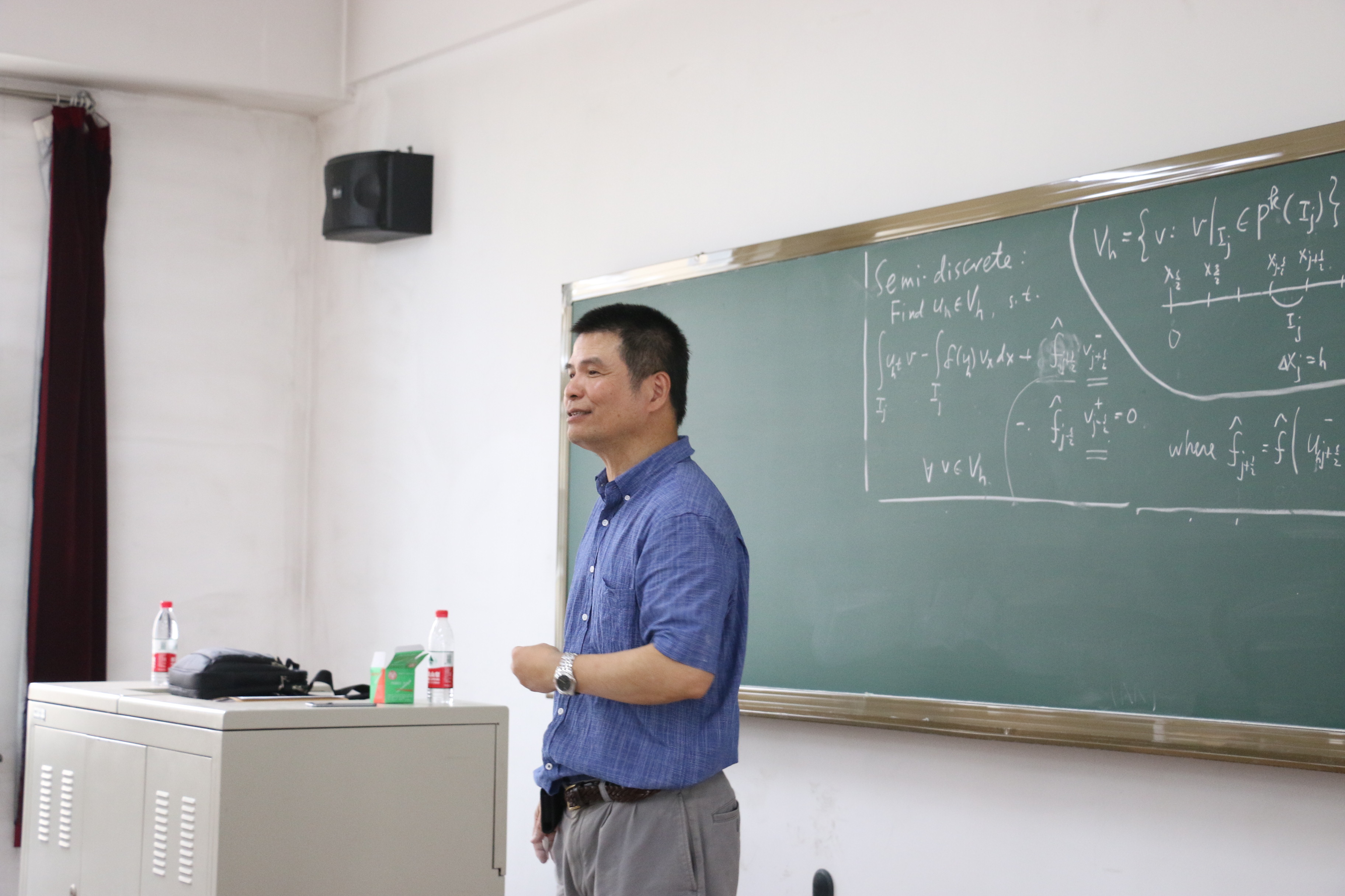 受哈工大本科生院及国际合作处资助,应数学系邀请,美国布朗大学舒其望教授于2017年7月16日至22日访问了我校,并讲授了名为“Discontinuous Galerkin methods for convection-dominated problems”的短期前沿课程。本课程共16学时(7月17号、18号、20号和21号下午的5-8节),主要介绍了求解对流占优偏微分方程的间断有限元方法,重点讨论了间断有限元格式的数值流通量选取、单元熵不等式与L2稳定性、最优收敛性以及高阶偏微分方程局部间断有限元方法的构造与分析等;共吸引了哈工大数学系及其它高校的师生共60余人前来聆听,并进行了热烈的讨论。通过本门课程的讲授,促进了同学们对高阶精度算法尤其是间断有限元方法的理解与掌握,培养了同学们解决实际工程科学计算问题的能力。