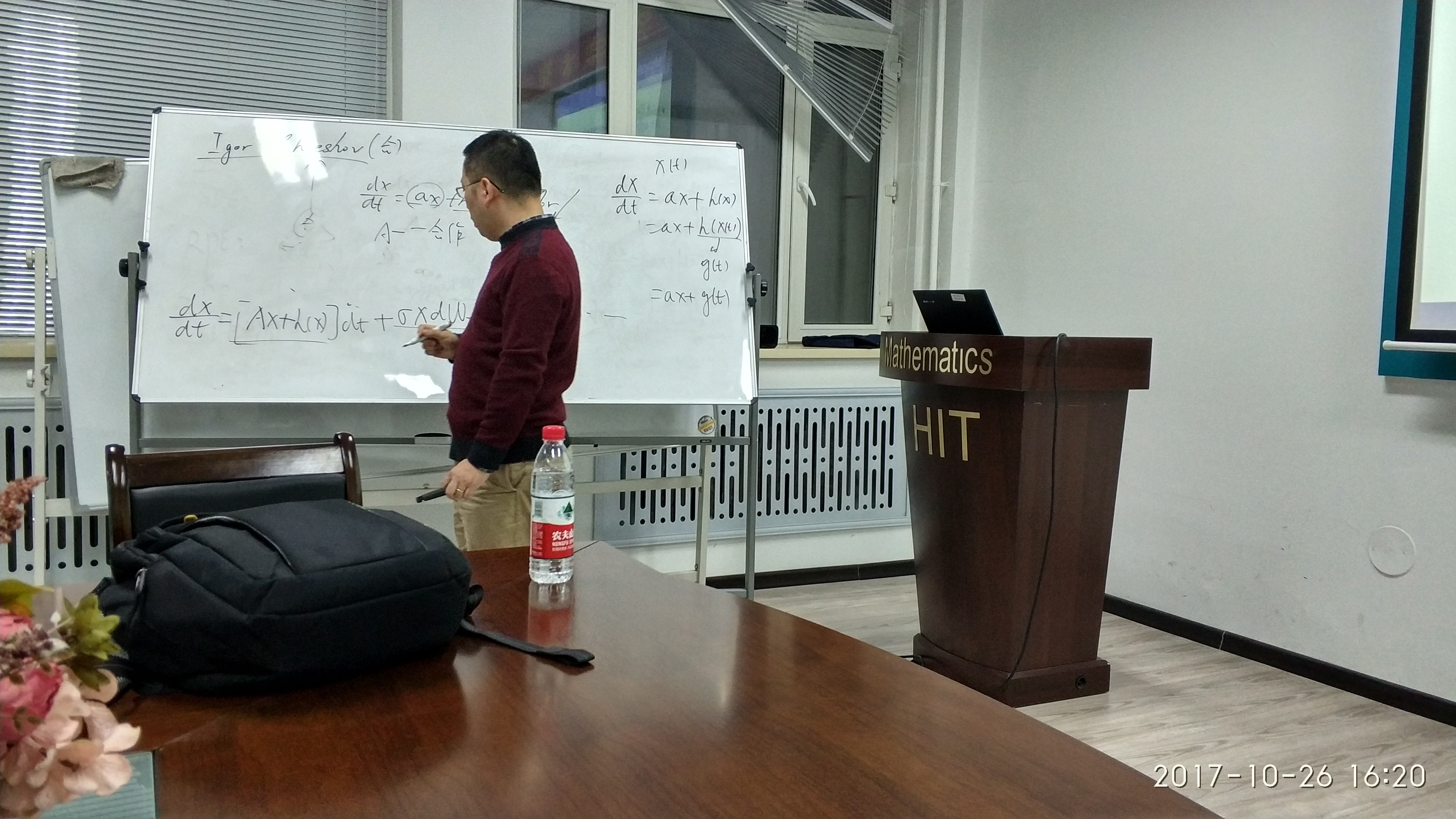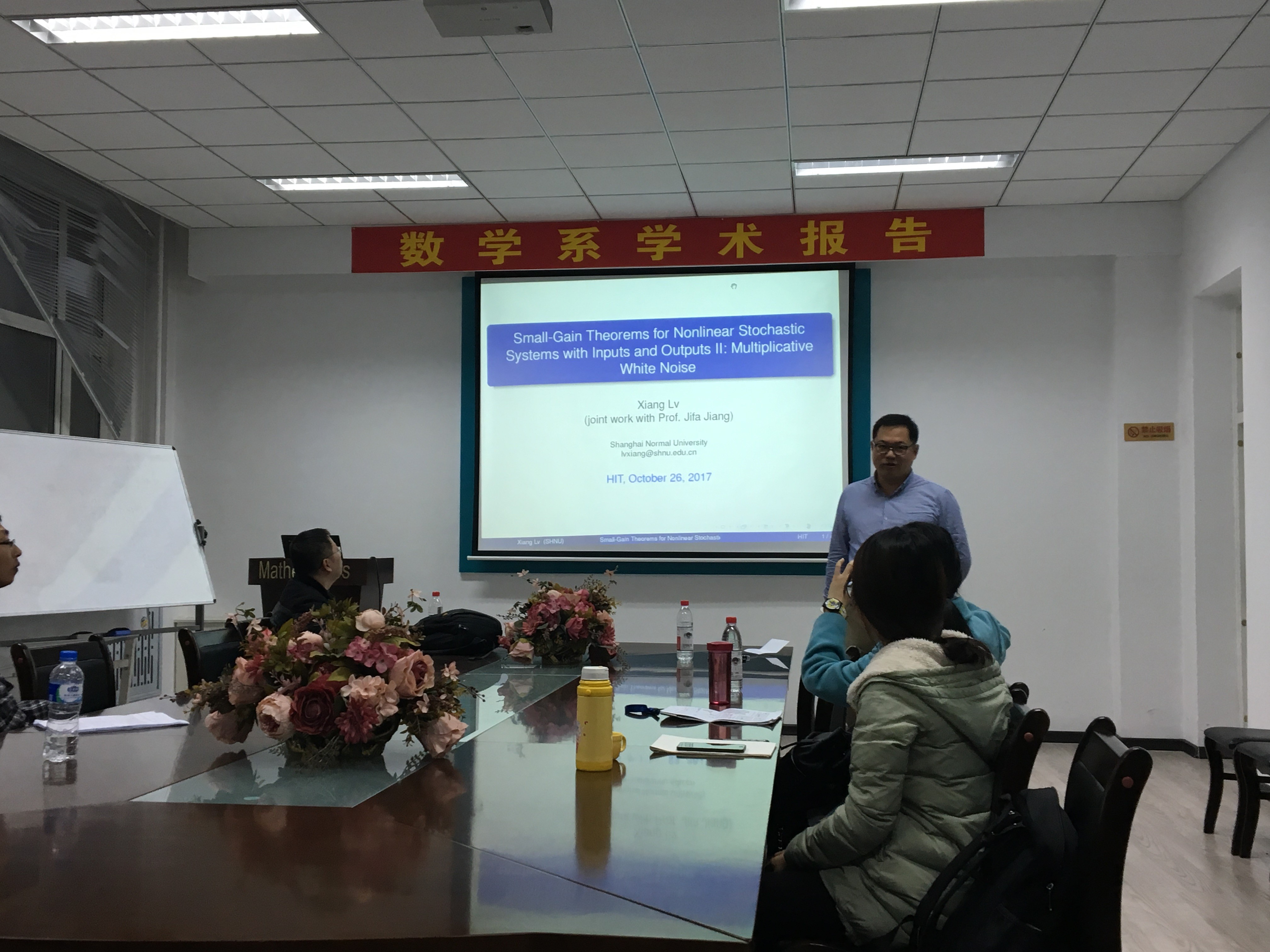 2017年10月26日 下午4:00,上海师范大学数理信息学院吕翔副教授在格物楼503会议室做了关于随机动力系统的精彩报告,题目为:“Small-gain theorems for nonlinear stochastic systems with inputs and outputs II: Multiplicative white noise case”,报告由刘胜强教授主持,数学系10余位师生听取了报告并进行了热烈的讨论。
