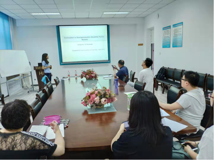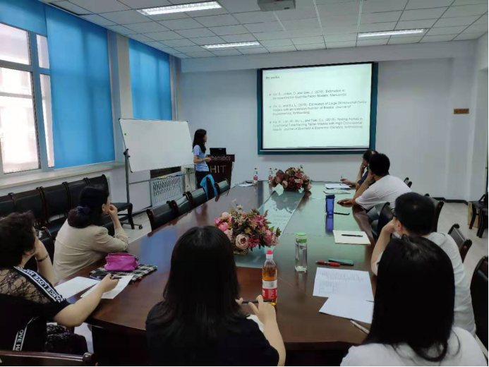 第三场报告时间为6月22日上午8:30-11:30,地点为格物楼503室,报告题为“Estimation and Inference in Semiparametric Quantile Factor Models”,“Estimation of large dimensional factor models with an unknown number of breaks”。这两个报告针对金融统计中一类重要模型——因子模型进行了系统的介绍,并对经济金融领域的面板数据建立了半参数因子模型,进一步对存在未知数目间断的因子模型进行了分析。
