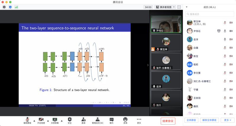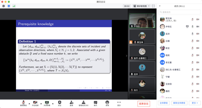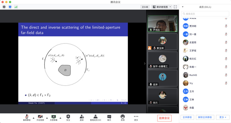应威廉官网中国官方网站郭玉坤副教授的邀请,长春理工大学数学系尹伟石副教授于2020年11月10日下午15:00-16:30为我院做了一场在线学术讲座。报告的平台为腾讯会议。尹老师以A neural network scheme for recovering scattering obstacles with limited phaseless far-field data为题目为我校师生做了一场精彩的学术报告,介绍了使用机器学习算法重构声波障碍物形状的反散射问题,报告了相关的数学理论和数值算法等前沿课题和最新进展。报告由郭玉坤副教授主持,30余名师生参加了此次在线学术活动,并在会议平台与尹老师进行了热烈的交流与讨论。
