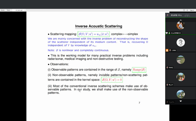 应威廉官网中国官方网站郭玉坤副教授和航天学院汪贤超博士的邀请,香港城市大学数学系刘宏宇教授于2021年4月22日上午10:00-11:30为我院做了一场精彩的在线学术讲座。报告平台为腾讯会议。刘宏宇教授的报告题目为:Invisibility enables super visibility.刘教授主要介绍了一类传输特征值问题,分析了特征函数的局部和全局性质,并给出了超分辨率成像的方法。报告由郭玉坤副教授主持,二十余名师生参加了此次在线学术活动,并在会议平台与刘宏宇教授进行了热烈的交流与讨论。