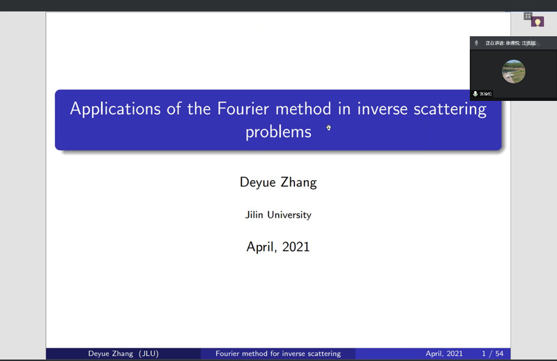 应威廉官网中国官方网站郭玉坤副教授和航天学院汪贤超博士的邀请,吉林大学威廉官网中国官方网站张德悦教授于2021年4月22日上午8:30-10:00为我院做了一场精彩的在线学术讲座。报告平台为腾讯会议。张德悦教授的报告题目为Applications of the Fourier method in inverse scattering problems. 张教授主要介绍了一类波动方程反源问题,构造了一种基于Fourier展开的快速反演方法,并给出详细的稳定性分析。报告由郭玉坤副教授主持,二十余名师生参加了此次在线学术活动,并在会议平台与张德悦教授进行了热烈的交流与讨论。
